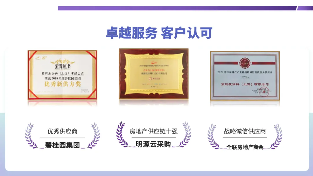 紫荊花作為深耕涂料領域40余年的民族品牌,擁有涵蓋內外墻涂料、地坪涂料、木器涂料、藝術涂料、無機涂料、防火涂料、防腐涂料、大壩、風電等特種涂料、防水材料、輔材等全體系產品,擁有德國藍天使、美國FDA、美國CPC、美國USDA生物基認證、美國綠色衛士金級認證、法國A+、日本JIS、中國綠色建材產品認證、中國環境標志產品認證等多項國內外權威認證,擁有國家級綠色工廠、CNAS國家認可實驗室等一系列品牌硬核實力,可為客戶提供全面、系統、專業的全場景涂裝解決方案,紫荊花優質完備的產品體系、高效的供應保障、專業的服務能力受到了戰略合作客戶的廣泛認可和好評。