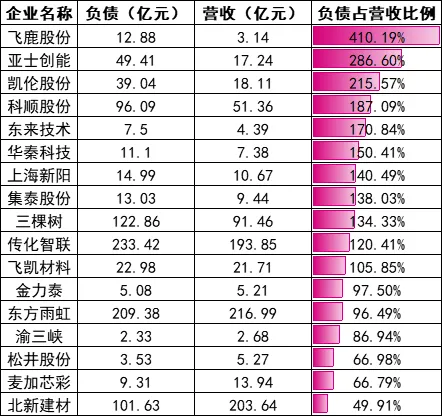 而細(xì)看涂料上市公司的負(fù)債數(shù)據(jù)則更為驚悚,部分涂料上市公司的負(fù)債高達(dá)100多億,遠(yuǎn)比營(yíng)業(yè)收入還要高。負(fù)債占營(yíng)收的比例超過(guò)了100%,飛鹿股份甚至高達(dá)410%。這意味著千辛萬(wàn)苦銷售入賬的錢還抵不上背負(fù)的債務(wù),這也讓涂料企業(yè)的資金鏈面臨重重危機(jī)。