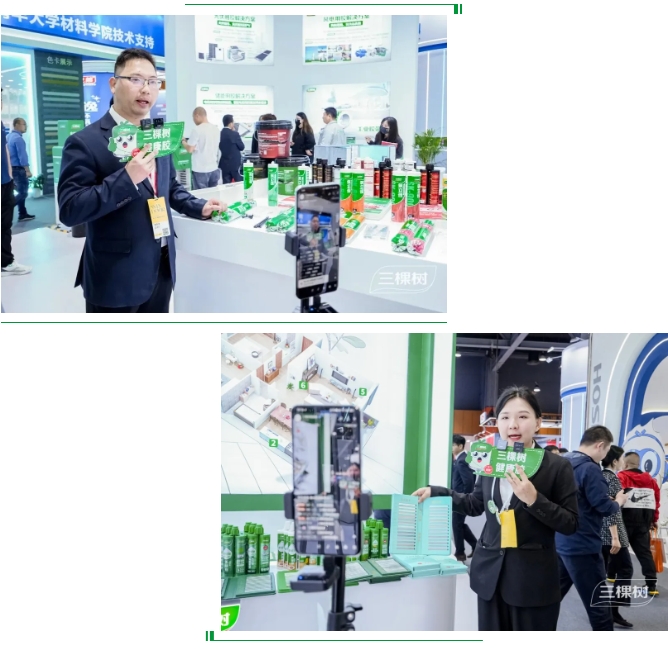 三棵樹通過雙平臺直播(視頻號、抖音號),便捷的觀展方式拉近了與合作伙伴的距離,顯著提升了推廣效果,讓未能親臨現場的朋友也能感受到三棵樹健康膠的魅力。