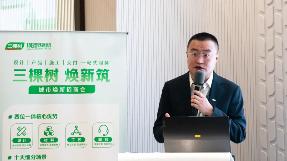 隨后,三棵樹城市煥新戰略部總監兼售前支持部總監華政安介紹城市煥新業務戰略定位。三棵樹憑借二十余年深厚的行業積累,依托全域空間設計、全筑美學理念、綠色產品體系等多方面優勢,為城市煥新打造集設計、產品、施工、交付于一體的一站式服務。其中,以內外墻無機涂料、工程藝術漆、工程板材,以及基輔材“四大金剛”產品為核心,構筑了城市煥新十大場景解決方案,引領行業邁向更高層次的發展,全面煥新城市活力。