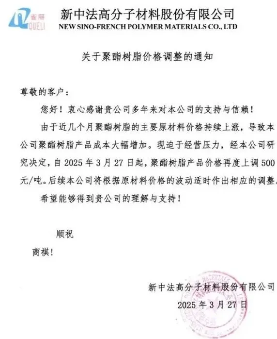 此前湛新樹脂曾于2月底宣布,3月1日起,對聚酯樹脂上漲含稅每噸500元整。也就是說,僅1個月的時間,這家龍頭企業的產品就上漲了1000元/噸。與此同時,另一家聚酯樹脂廠——新中法高分子材料也發布漲價函,稱近幾個月主要原材料價格持續上漲,導致成本大幅增加,經研究決定自3月27日起,聚酯樹脂產品價格再度上調500元/噸。