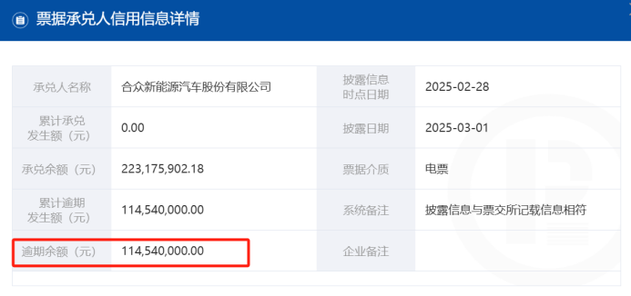 近日,哪吒汽車母公司合眾新能源汽車股份有限公司首次出現(xiàn)商票逾期,逾期金額1.1454億元,并登上票交所最新發(fā)布的《承兌人逾期名單》,票交所依規(guī)暫停其商票承兌功能。