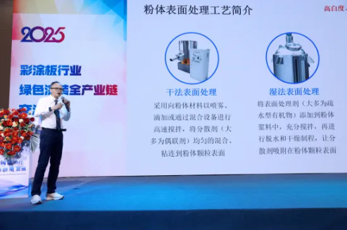 集美精化趙總為大家重點展示了專門為粉末涂料應用場景設計開發的專用型號新產品—GM-100表面處理硫酸鋇,憑借其“超乎鏡面的高光澤、卓越的流平性能以及支持50μm超薄涂性能”等特點,吸引了眾多參會行業大咖的特別關注。