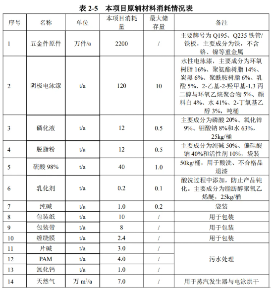 根據企業提供的資料,本項目電泳采用水性電泳漆,電泳漆固化后成膜厚度約0.1mm,干漆膜密度以1.25g/cm3計。電泳漆利用率以100%計,則本項目所需電泳漆固體份用量為55t/a。根據業主提供的電泳漆MSDS 資料,電泳漆固含量約55%,則理論上需要電泳漆100t/a,本項目電泳漆總用量為120t/a,可以匹配實際需求。