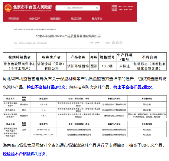北京市豐臺(tái)區(qū)公示產(chǎn)品質(zhì)量監(jiān)督抽查結(jié)果,檢出不合格涂料樣品1批次。