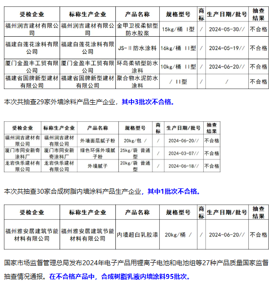 浙江省市場(chǎng)監(jiān)督管理局發(fā)布2024年度浙江省級(jí)LED讀寫(xiě)臺(tái)燈、換氣扇等83種產(chǎn)品質(zhì)量監(jiān)督抽查情況的通告。抽查6批次防火涂料產(chǎn)品,其中1批次產(chǎn)品不合格。抽查11批次建筑防水涂料產(chǎn)品,其中1批次產(chǎn)品不合格。抽查59批次外墻涂料產(chǎn)品,其中6批次產(chǎn)品不合格。