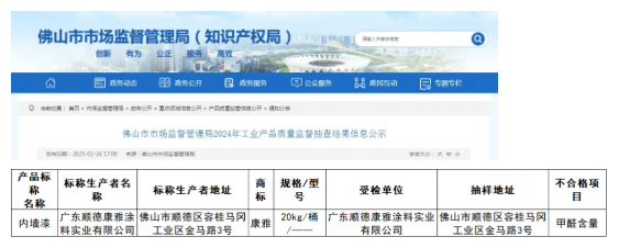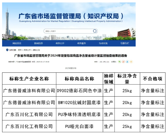 廣東省佛山市市場(chǎng)監(jiān)督管理局公示2024年工業(yè)產(chǎn)品質(zhì)量監(jiān)督抽查結(jié)果,1批次涂料不合格。