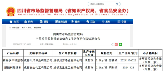 四川省市場(chǎng)監(jiān)督管理局發(fā)布產(chǎn)品質(zhì)量監(jiān)督抽查2025年2月復(fù)查不合格情況公告,涉及涂料2批次。