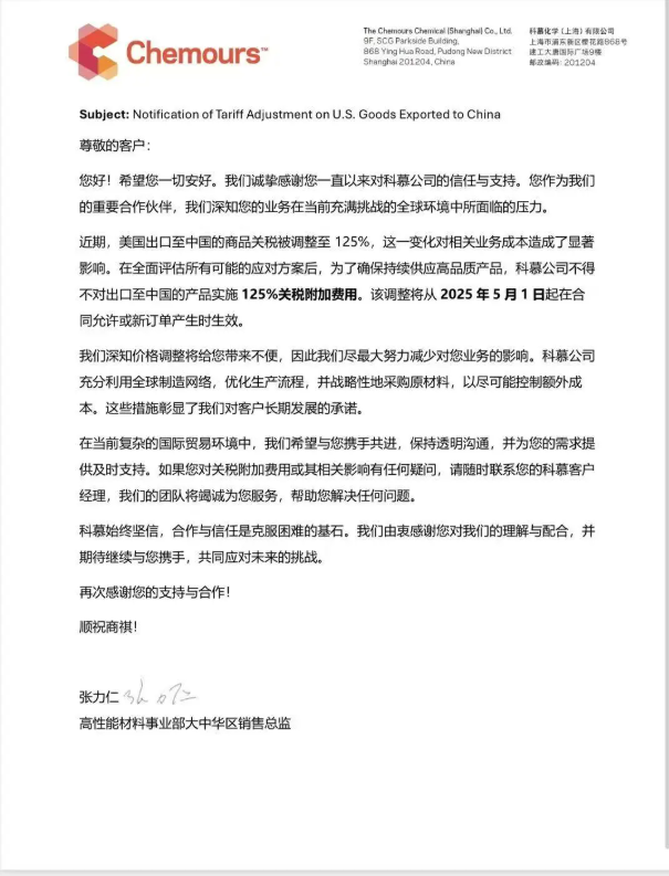 科慕在漲價函中明確表示,此次調價源于美國出口至中國商品關稅被調整至125%,這一變化導致其相關業務成本大幅攀升。經過全面評估各類應對方案,為保障高品質產品的持續供應,公司不得已做出這一決定。此次價格調整將于2025年5月1日起,在合同允許的情況下或新訂單產生時正式生效。