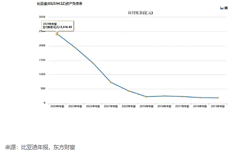 這幾年正是企業最困難的時候,但是比亞迪欠供應商貨款,從2019年的225億飆升至2024年的2416億,5年欠款增長了接近10倍,近10年增長12倍。