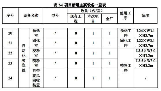 根據建設單位提供的資料,本次項目新增的設備包括1套自動化噴塑線,1套自動化噴塑固化室,1套自動化噴塑線噴粉室,1套自動化噴塑線浸粉室,1套自動化噴塑線自帶旋風回收裝置。