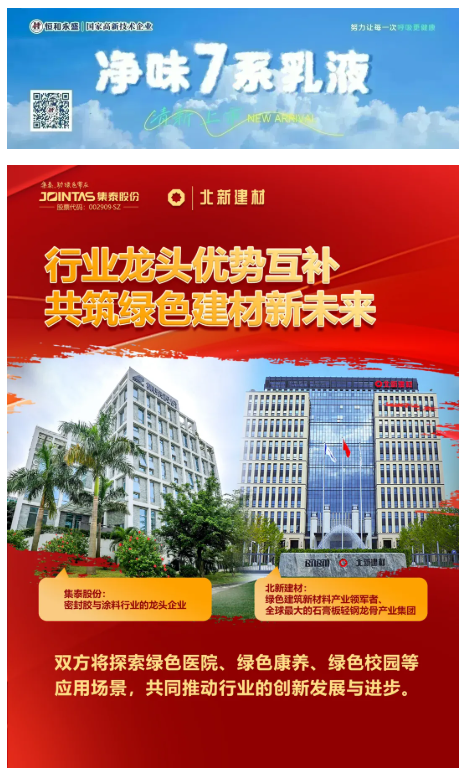 北新建材作為中國建材集團旗下的核心企業,已成長為全球最大的石膏板輕鋼龍骨產業集團;集泰股份在密封膠、涂料領域具備深厚技術積累和豐富市場經驗,是綠色建材行業的標桿企業。兩大龍頭的合作,標志著產業邁入協同發展階段,將加速低碳轉型進程。