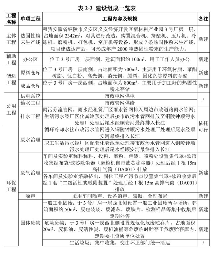 銅陵昶祥新材料科技有限公司擬于安徽省銅陵市義安區(qū)義安經(jīng)濟(jì)開(kāi)發(fā)區(qū)新材料產(chǎn)業(yè)園建設(shè)年產(chǎn)2000噸新能源汽車、白色家電新材料項(xiàng)目(一期),系租賃銅陵金橋建設(shè)投資有限公司新材料產(chǎn)業(yè)園 3#廠房一層,占地面積 2342m2.對(duì)其進(jìn)行改造,購(gòu)置混合機(jī)、擠塑機(jī)、壓片機(jī)、冷凍機(jī)、磨粉機(jī)、打包機(jī)、空壓機(jī)等設(shè)備,項(xiàng)目建成達(dá)產(chǎn)后,可形成年產(chǎn)2000噸熱固性粉末的生產(chǎn)能力。