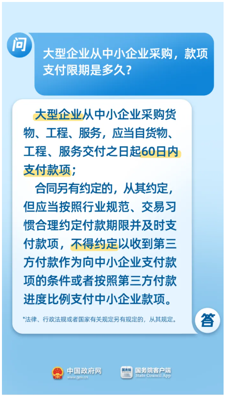 根據802號文件規定,機關、事業單位從中小企業采購貨物、工程、服務,應當自貨物、工程、服務交付之日起30日內支付款項,付款期限最長不得超過60日;大型企業從中小企業采購貨物、工程、服務,應當自貨物、工程、服務交付之日起60日內支付款項。