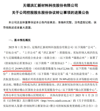近日,據(jù)無錫洪匯新材料科技股份有限公司發(fā)布《關(guān)于公司控股股東股份協(xié)議轉(zhuǎn)讓事項(xiàng)的進(jìn)展公告》稱:洪匯新材控股股東、實(shí)際控制人項(xiàng)洪偉與無錫錫港啟興科技合伙企業(yè)(有限合伙))簽署了《股份轉(zhuǎn)讓協(xié)議》,項(xiàng)洪偉擬將其持有的公司29.99%的股份(對(duì)應(yīng)的股票數(shù)量為54.672.366股)協(xié)議轉(zhuǎn)讓給錫港啟興。