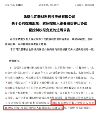 根據(jù)洪匯新材2025-020號(hào)公告顯示,標(biāo)的股份的轉(zhuǎn)讓價(jià)格為人民幣15.9077元/股,交易總價(jià)約為人民幣86.971.1596萬元。本次交易不觸及要約收購,不構(gòu)成關(guān)聯(lián)交易。