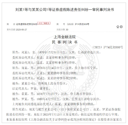 近日,裁判文書網(wǎng)披露了一份劉某1等與某某公司1等證券虛假陳述責(zé)任糾紛一審民事判決書。該判決書未公開原被告雙方身份信息,不過,紅星資本局比對(duì)案號(hào)、案情等細(xì)節(jié)得知,這份判決書正是前述金力泰案一審判決書。