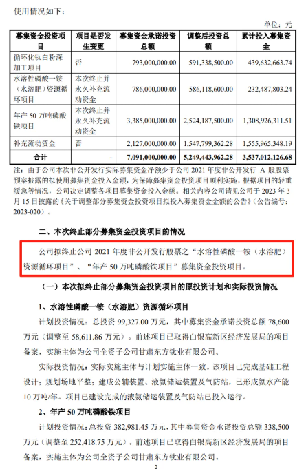 6月2日,中核華原鈦白股份有限公司公告稱,擬終止公司2021年度非公開發行股票之“水溶性磷酸一銨(水溶肥)資源循環項目”及“年產50萬噸磷酸鐵項目”募集資金投資項目,并將剩余募集資金16.66億元永久補充流動資金,用于公司日常生產經營及業務發展。