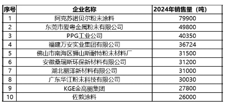 榜單顯示,作為國(guó)內(nèi)最大的粉末涂料企業(yè),阿克蘇諾貝爾粉末涂料79900噸位居榜首,這已是阿克蘇諾貝爾連續(xù)9年蟬聯(lián)中國(guó)粉末涂料銷量100強(qiáng)之首,同比增長(zhǎng)7%,其增速較2023年增速提升了2.5個(gè)百分點(diǎn),足以證明阿克蘇諾貝爾在中國(guó)粉末涂料行業(yè)具有很強(qiáng)的市場(chǎng)競(jìng)爭(zhēng)力。其次是東莞市愛粵金屬粉末有限公司以49800噸位居第二,同比增長(zhǎng)2%;排名第三則是PPG工業(yè)公司40350噸,同比增長(zhǎng)1%。和2023年中國(guó)粉末涂料百強(qiáng)排行榜相比,前三名的粉末涂料企業(yè)并沒有發(fā)生變化。