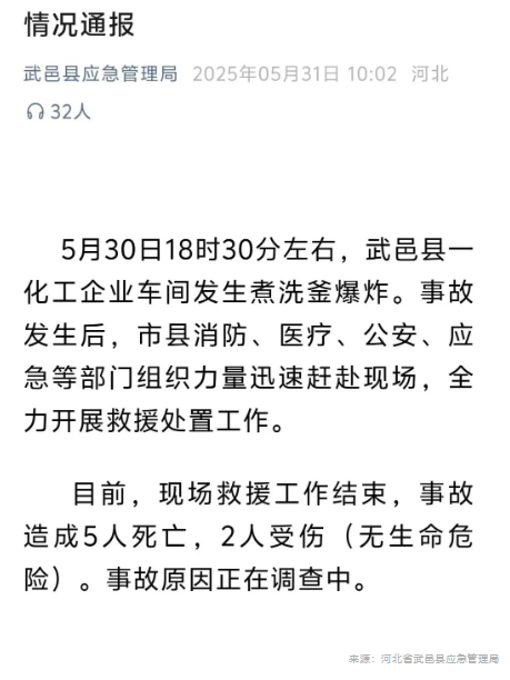 5月31日,河北省武邑縣應急管理局發布通報:5月30日18時30分左右,武邑縣一化工企業車間發生煮洗釜爆炸。事故發生后,市縣消防、醫療、公安、應急等部門組織力量趕赴現場,全力開展救援處置工作。