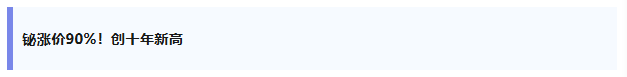 3月初海外鉍錠價格為50萬元/噸,國內鉍錠價格也上漲至15萬元/噸,部分報價沖擊20萬元/噸,年內累計上漲近90%,創近十年新高。