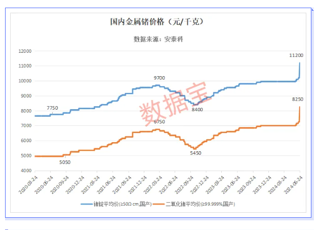 而需求端,地緣局勢持續發酵使得軍工紅外用鍺、衛星太陽能電池、無人機需求爆發式增長,同時通信、光伏等領域發展持續火爆,提振了光伏、光纖等用鍺需求量,到10月底,鍺相關產品價格較年初已近翻倍。2024年鍺價同比上漲15%,2025年初更是突破萬元大關,創下12750元/千克的歷史新高。衛星、無人機等新興需求推動鍺價2025年1-2月單月暴漲40%。