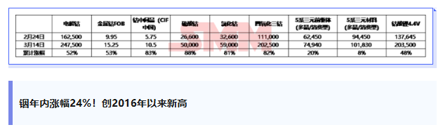 3月以來,鈷價連續三周大幅上漲,漲幅分別達到12.20%、9.61%和9.96%。目前國內鈷報價225000元/噸—278000元/噸之間,本月以來漲幅近37%。截至3月14日,鈷系各產品價格均實現大幅上漲。其中,硫酸鈷、氯化鈷、鈷中間品十幾日的累計漲幅均大于80%。鈷是三元鋰電池的重要原料,隨著新能源汽車和消費電子領域的快速發展,鈷的需求持續增長。