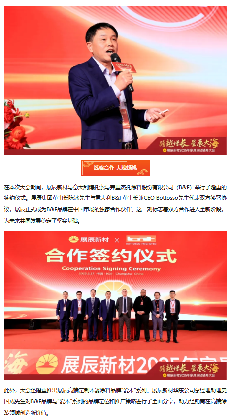 湖南省家具行業協會執行會長兼秘書長劉發剛先生,意大利博托索與弗里杰托涂料股份有限公司董事長兼CEO Mr.Alessandro Bottosso、技術總監Mr.Andrea Frighetto,廣東省涂料與油墨行業協會會長、展辰集團董事長陳冰先生,副董事長陳壽生先生,常務副總裁兼財務信息中心總經理全松林先生,輪值總裁兼華東公司總經理劉順先生,副總裁兼北方公司總經理劉華東先生,珠海工廠及海外公司總經理李旭汕先生,膠粘劑事業部總經理周言明先生,戰略投資部及國際貿易部總經理肖志軍先生,人事行政中心總經理熊焰女士,技術管理中心總經理劉志剛先生,生產供應中心總經理肖勁先生,市場營銷中心總經理楊求貴先生,產品管理中心副總經理劉寶山先生等嘉賓及領導,與經銷商代表們歡聚一堂,共同回顧2024年攜手走過的不凡征程,展望2025年的宏偉藍圖,攜手同心,全面開啟2025年的新征程。