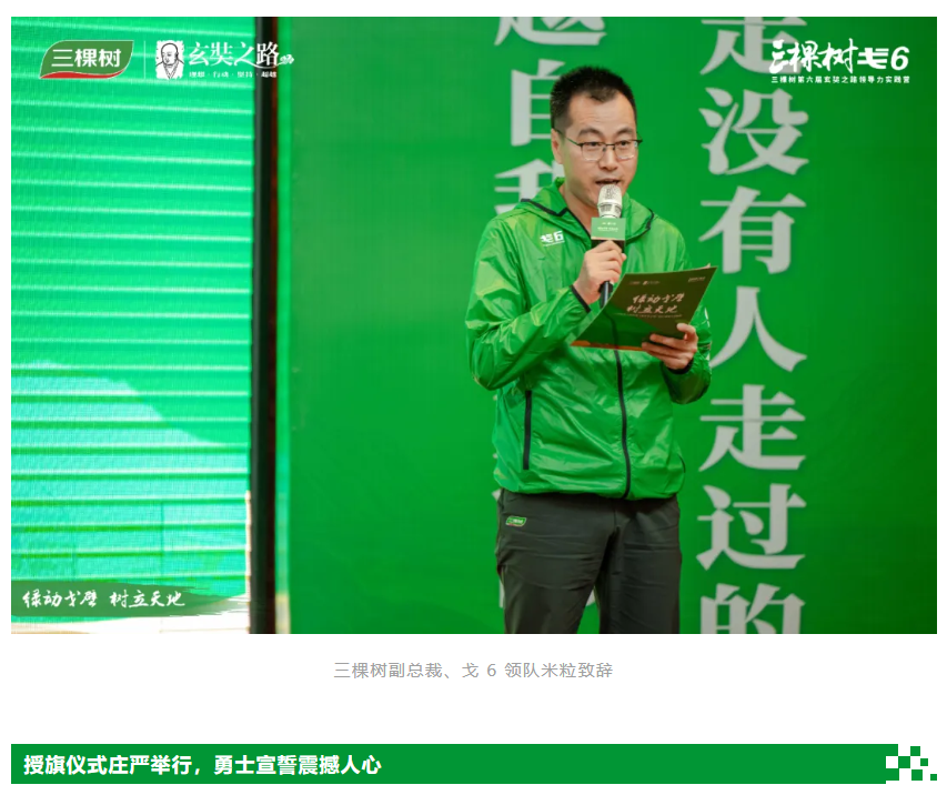 在戈6集結(jié)儀式上,三棵樹副總裁、戈6領(lǐng)隊(duì)米粒致辭強(qiáng)調(diào),戈6是三棵樹企業(yè)文化與實(shí)踐的又一次深度融合。每一步腳印,都凝結(jié)著團(tuán)隊(duì)的智慧與汗水。米粒以玄奘大師孤身穿越戈壁的堅(jiān)定信念激勵(lì)團(tuán)隊(duì),如同在工作中協(xié)同搏擊,戈壁之上“全面協(xié)同”更是制勝密碼,將個(gè)人力量淬煉成無堅(jiān)不摧的團(tuán)隊(duì)合力!他勉勵(lì)全體戈壁勇士堅(jiān)定信念、勇往直前,踏出堅(jiān)實(shí)足跡,共同譜寫三棵樹的新篇章!