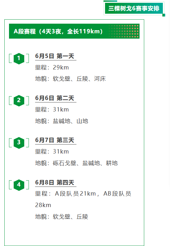 隨著集結(jié)儀式的圓滿結(jié)束,三棵樹戈6的征程正式拉開帷幕。A隊(duì)勇士們將在接下來的四天三夜里,穿越戈壁、河谷、山脈、鹽堿地,完成119公里的艱難挑戰(zhàn);而AB隊(duì)勇士們則將在A隊(duì)119公里基礎(chǔ)上,繼續(xù)前行四天三夜,完成更為艱苦的120公里B段路線。兩支隊(duì)伍將書寫屬于三棵樹的傳奇故事,用實(shí)際行動(dòng)詮釋“超越自我 永遠(yuǎn)向上——走沒有人走過的路”的戈6主題。