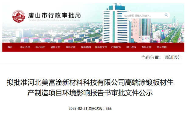 河北美富淦新材料科技有限公司擬投資34.5億元建設(shè)的高端涂鍍板材生產(chǎn)制造項(xiàng)目,已于2024年6月24日在樂亭縣行政審批局備案,備案編號為樂審批項(xiàng)備〔2024〕7-0048.