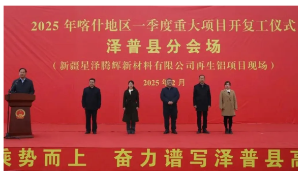 2月28日,新疆星澤騰輝新材料有限公司再生鋁項目參與了澤普縣2025年第一季度重大項目集中開工儀式。據悉,該項目總投資2.3億元,建成后,預計年產量10萬噸。