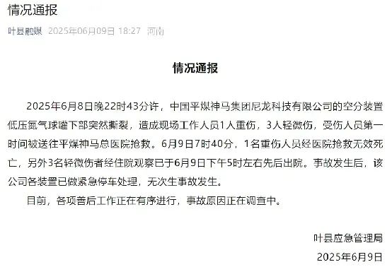 6月8日,河南省葉縣中國平煤神馬集團(tuán)尼龍科技有限公司空氣分離裝置低壓氮?dú)馇蚬尴虏客蝗凰毫眩斐?人死亡、3人輕微傷。