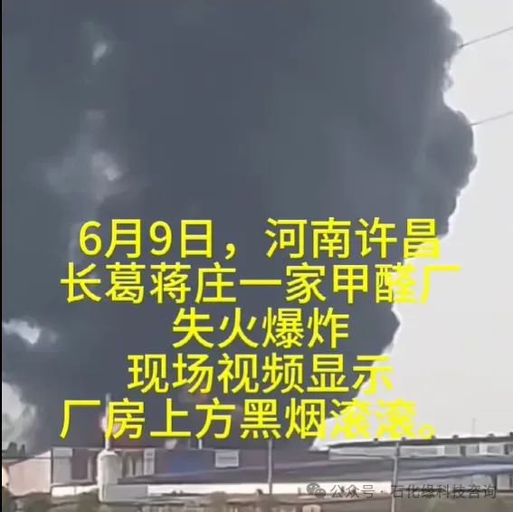 6月9日,河南許昌長葛蔣莊一家甲醛廠發(fā)生失火并伴隨爆炸情況。事故未造成人員傷亡。