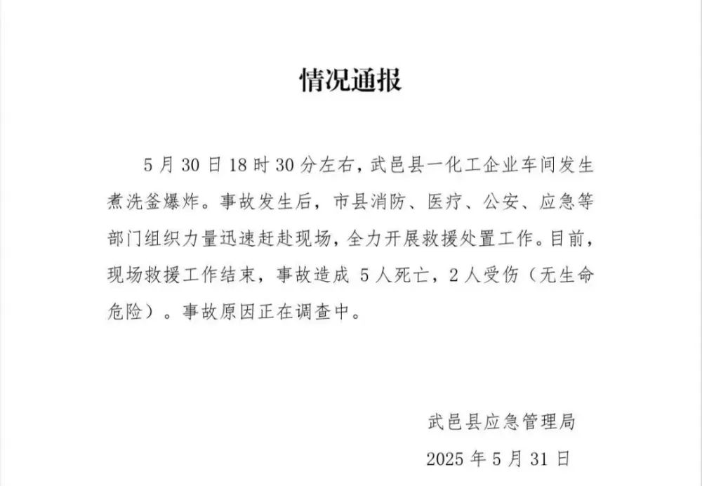 5月30日,武邑縣一化工企業(yè)車間發(fā)生煮洗釜爆炸,事故造成5人死亡,2人受傷(無生命危險(xiǎn))。