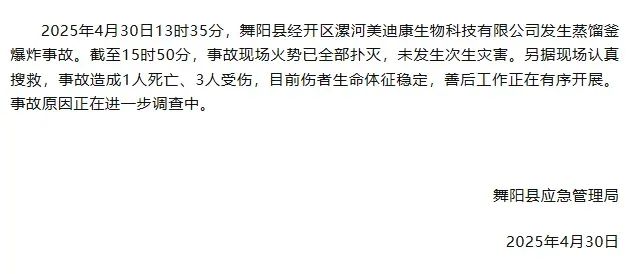 4月30日,河南省漯河市舞陽縣經(jīng)開區(qū)漯河美迪康生物科技有限公司發(fā)生蒸餾釜爆炸事故。事故造成1人死亡、3人受傷。