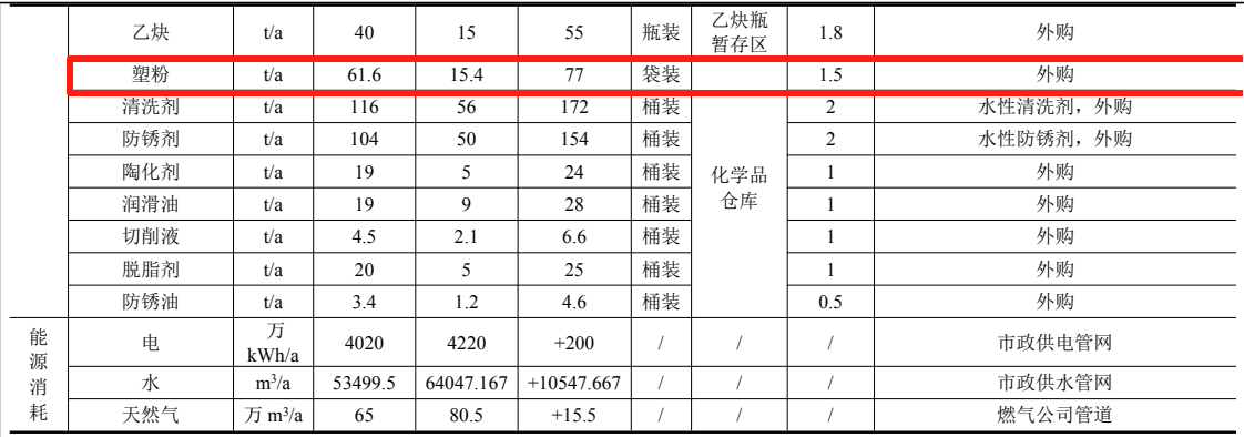 現有項目年產消音器1500萬件,年用塑粉量為46.2t/a,本項目不改變產品規格和塑粉種類,年新增消音器500萬件,因此年新增塑粉使用量15.4t/a。