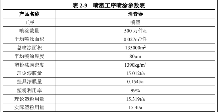 塑粉用量核算:本項目消音器生產需進行噴塑,粉末噴涂過程是在封閉噴粉房內進行的,且呈負壓,通過噴粉大旋風+二級濾芯回收裝置,將粉末收集后送回供粉系統循環使用,參考《污染源源強核算技術指南汽車制造》(HJ1097—2020)附錄F,濾筒過濾裝置顆粒物去除效率為80%~99.9%,本項目大旋風雙級濾芯回收裝置粉塵去除效率可達99.9%以上,剩余約0.1%粉塵無組織排放。其中一級濾芯回收約94%的塑粉循環使用,二級濾芯回收其余5.0%小顆粒塑粉,此部分不可直接回收用于正常產品噴塑,回收集中后用于殘次品的噴塑,剩余1%左右微細粉無法回用產生廢塑粉,作為一般固廢處置。