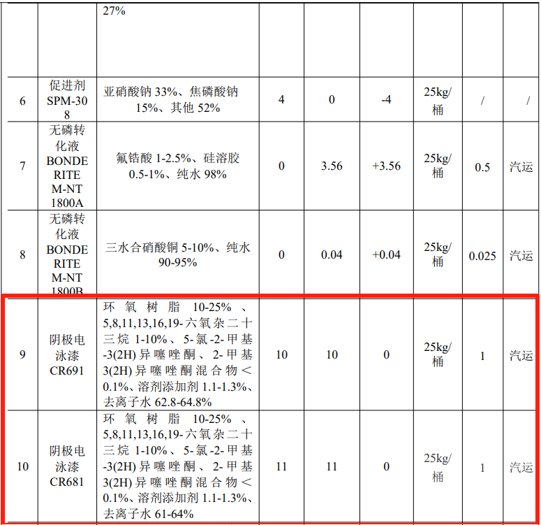 電泳漆:本項目陰極電泳漆CR691.用量為10t/a,陰極電泳漆CR681.用量為11t/a,電泳漆CP524C,用量為4t/a;電泳工序運行時將電泳漆樹脂CR691/CR681與水和電泳漆CP524C進行配比;根據檢測報告,去水狀態下電泳漆樹脂CR681和電泳漆CP524C配比后的VOC含量131g/L、電泳漆樹脂CR691和電泳漆CP524C配比后的VOC含量91g/L。滿足《低揮發性有機化合物涂料產品技術要求》(GB/T 38597-2020)水性涂料中車輛涂料電泳底漆限量值200g/L。