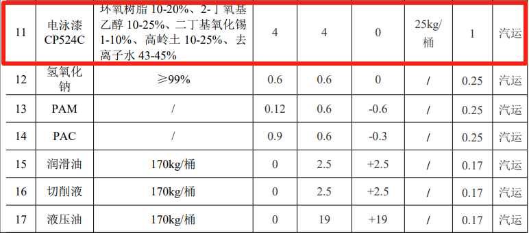 項目電泳槽配備“超濾設備”對電泳槽液進行超濾回收處理,項目電泳漆利用率約為95%,剩余的5%形成超濾濾渣和沾至掛具上電泳廢渣一起按危廢處置。本項目電泳漆固體分總量約為5t。則項目電泳渣產生量約為0.25t,附著在工件上的物料為4.75t。與本項目實際年用量基本相符。
