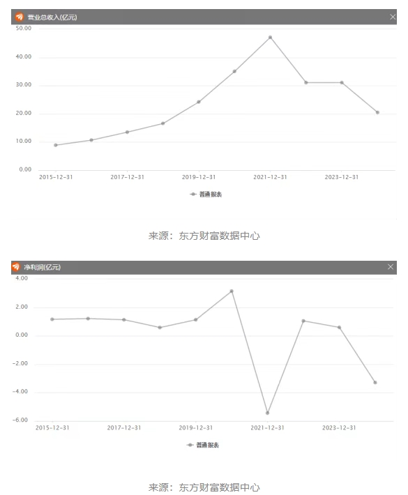 從近十年的亞士創能的營收情況來看,高峰點出現在2021年,營收為47.15億,然而2021年亞士創能的凈利潤虧損5.4億元,隨后雖有上漲,但依然難逃厄運。