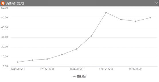 從近十年亞士創能的負債合計來看,2015年亞士創能的負債只有4.62億元,2021年負債達到最高值,總負債55.62億元,增長1103%,雖然自2021年之后有所下降,但在2024年也達到了50.32億元,負債率達到79.4%,已接近80%的紅色警戒線,仍處于高位。