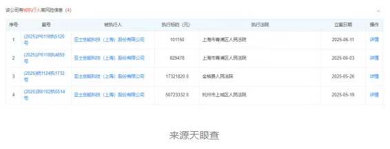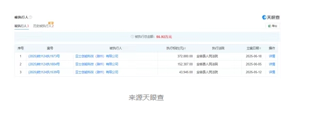 亞士創能控股的亞士創能科技(滁州)有限公司2025年5月份以來,3次被列入被執行人信息,執行標的56.92萬元。