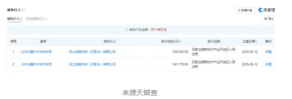 亞士創能科技(石家莊)有限公司2025年5月份以來,2次被列入被執行人名單,執行標的37.18萬元。