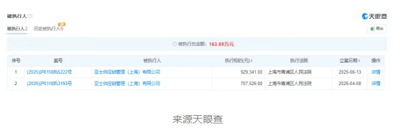 亞士創能控股的亞士供應鏈管理(上海)有限公司2025年5月份以來,2次被列入被執行人名單,執行標的163.69萬元。