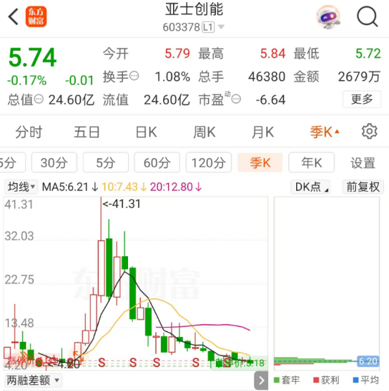 截止2025年6月20日,亞士創能的股價僅為5.74元/股,總市值也只有24.6億元,較最高值減少143.9億,蒸發85%。