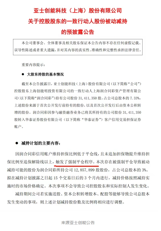 亞士創能公布,因潤合同彩信用賬戶維持擔保比例低于平倉線,且未追加擔保物提升維持擔保比例至追保解除線以上,觸發了強制平倉程序。本次存在被強制平倉導致被動減持可能的股份為潤合同彩所持公司12.857.899股股份,占公司總股本的3%。擬在減持計劃披露之日起15個交易日后的3個月內進行,減持價格按照減持實施時的市場價格確定。