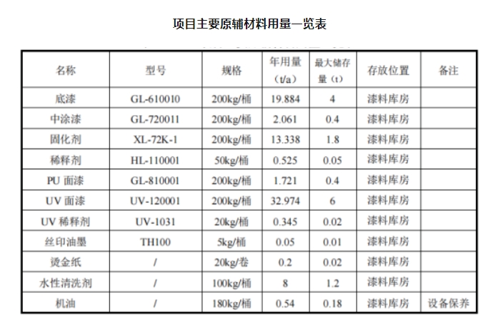 除此之外,即用狀態(tài)下水性底漆年用量為0.78t/a、水性UV漆0.80t/a、水性面漆1.51t/a,調(diào)配后水性涂料合計年用量為3.09t/a。其中水性底漆年用量0.65t/a、水性UV漆年用量0.80t/a、水性面漆年用量1.26t/a。