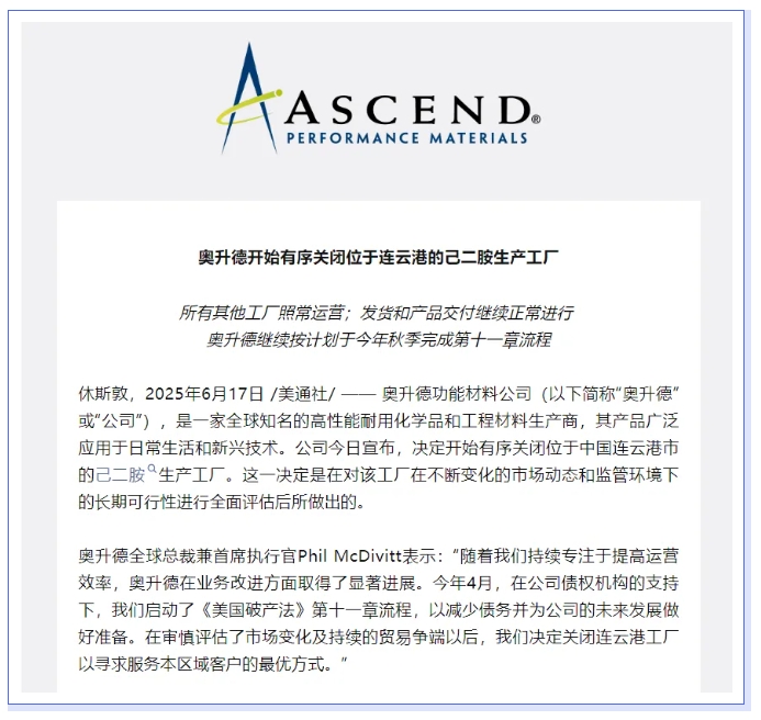 早在2024年2月,奧升德便已關閉美國南卡羅來納州格林伍德的尼龍66聚合物工廠,并計劃將產能集中至佛羅里達州彭薩科拉基地;同年4月,又宣布將荷蘭的高性能尼龍66產能遷移至意大利生產基地。這種“關停轉移”策略的核心,在于通過資源整合聚焦成本更低、技術更優的本土產能,以強化全球市場競爭力。