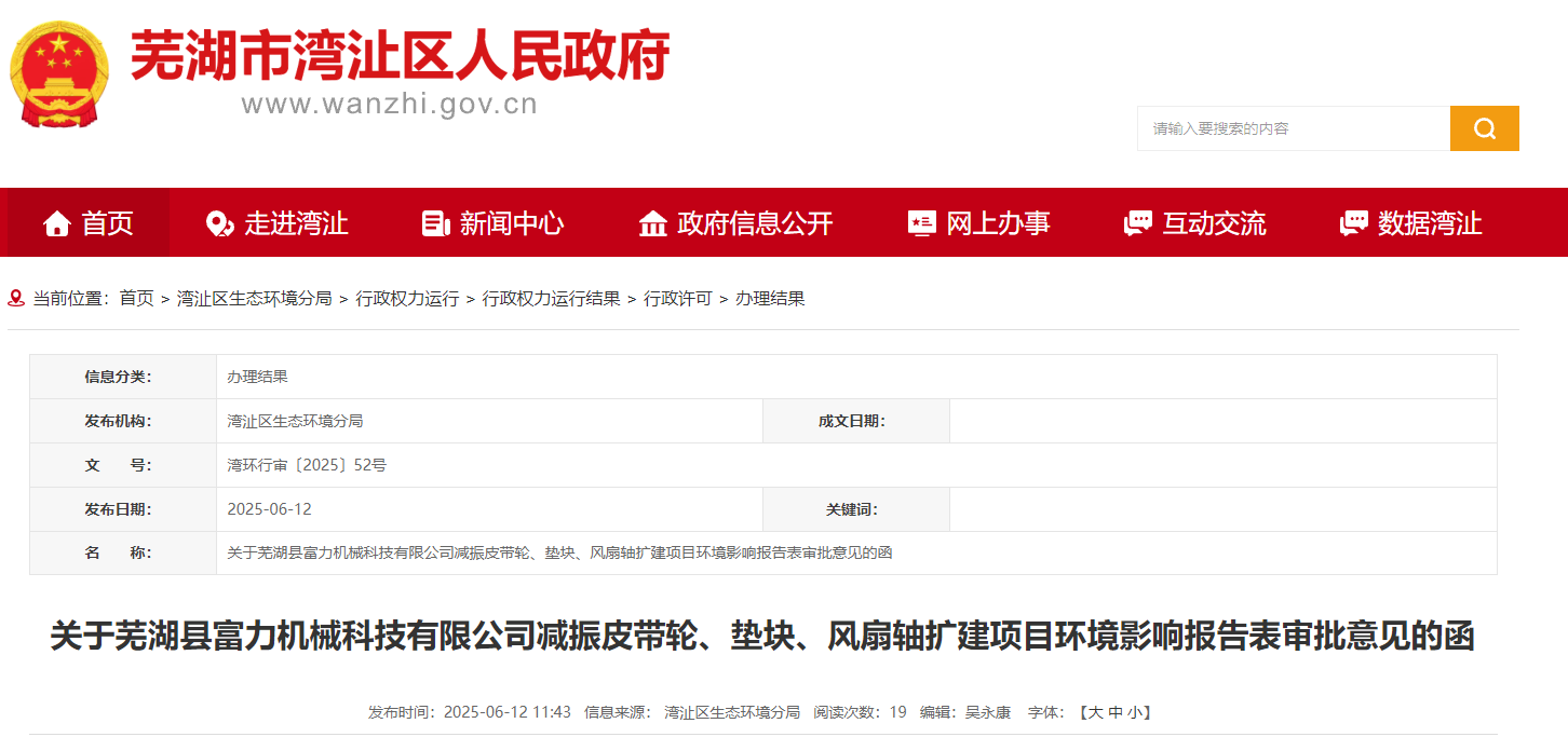 你公司報送的《蕪湖縣富力機(jī)械科技有限公司減振皮帶輪、墊塊、風(fēng)扇軸擴(kuò)建項(xiàng)目環(huán)境影響報告表》(以下簡稱報告表)收悉。根據(jù)《蕪湖市生態(tài)環(huán)境局關(guān)于印發(fā)<蕪湖市建設(shè)項(xiàng)目環(huán)境影響評價文件分級審批管理暫行辦法>的通知》文件規(guī)定,我局決定受理該項(xiàng)目環(huán)評文件,按要求對《報告表》進(jìn)行審查,并在灣沚區(qū)政府信息公開網(wǎng)進(jìn)行受理與批前公示,期間未收到任何異議。現(xiàn)根據(jù)《中華人民共和國環(huán)境影響評價法》及有關(guān)法律法規(guī)規(guī)定,批復(fù)如下: